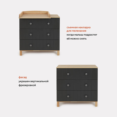 Продуманный до мелочей! Вместительный пеленальный комод Bamboo идеально впишется в интерьер как детской комнаты, так и родительской спальни. Модель, выполненная в уютном скандинавском стиле, дополнена съемной накладкой для пеленания, усиленными телескопическими направляющими, фасадами, украшенными вертикальной фрезеровкой. Комфортная ширина, позволяющая как переодевать малыша, так и хранить необходимые предметы гигиены рядом. Фасады комода украшены вертикальной фрезеровкой. Вместительные выдвижные ящики бесшумны - они не потревожат спящего малыша. К тому же ящики дополнены специальными телескопическими направляющими, благодаря которым комод способен выдерживать большие нагрузки на протяжении длительного времени. Также ящики снабжены удобными анатомическими ручками эффектного стального цвета. Конечно же, комод имеет бортик, превращающий его в полноценный пеленальный столик. Бортик можно легко установить в трех положениях (слева, по центру, справа). Когда малыш подрастёт, бортик можно будет снять. Фасады комода изготовлены из высококачественного и экологически чистого материала. Комод обработан безопасными для здоровья младенца красками на водной основе.