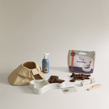 Игрушечный набор со всеми необходимыми аксессуарами для ухода за собакой: включает в себя миску, корм, дождевик, шампунь, расческу и карточку со всеми деталями.