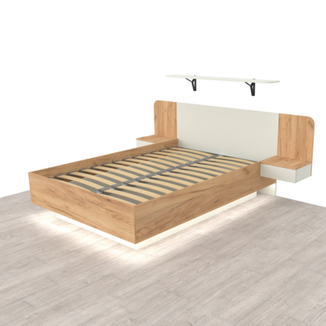 Кровать с лаунж подсветкой, направленной в пол. Свет нейтральный белый, светодиодный. Освещение создает эффект парения. Нижний короб заглублен по бокам. Из-за этого удобно подходить вплотную к кровати, чтобы, например, сменить белье. Никогда не ударитесь ногой о низ кровати. В комплекте надежный подъемный механизм. Есть вместительный короб для хранения белья. Особенно актуально для малогабаритных помещений, где не хватает места в шкафах. Основание реечное, ортопедическое, фирмы Via Ferrata, известная своим качеством. К подсветке сделан сенсорный выключатель, который выведен в спинку. Включите или выключите свет легким прикосновением. Трансформатор, провод и вилка – идут в комплекте. Остается только включить в розетку. С двух сторон от изголовья ящики с доводчиком с системой открывания “нажал-открыл”.