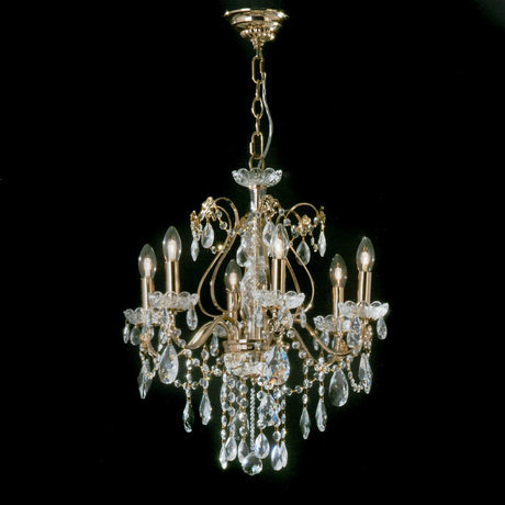 Люстра 6-ти рожковая на металлической арматуре цвета французское золото. Дизайн ламп выполнен в виде свечей в подсвечниках. Декор: подвески и кулоны из прозрачного хрусталя. Высота светильника регулируется за счет звеньев цепи. Количество лампочек: 6. Мощность: 6 x 60 Вт. Тип лампы: Накаливания, E14.