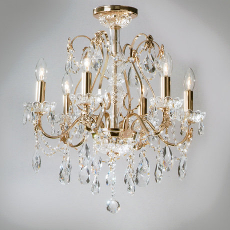 Потолочный светильник 6-ти рожковый на металлической арматуре цвета французское золото. Дизайн ламп выполнен в виде свечей в подсвечниках. Декор: подвески и кулоны из прозрачного хрусталя. Количество лампочек: 6.